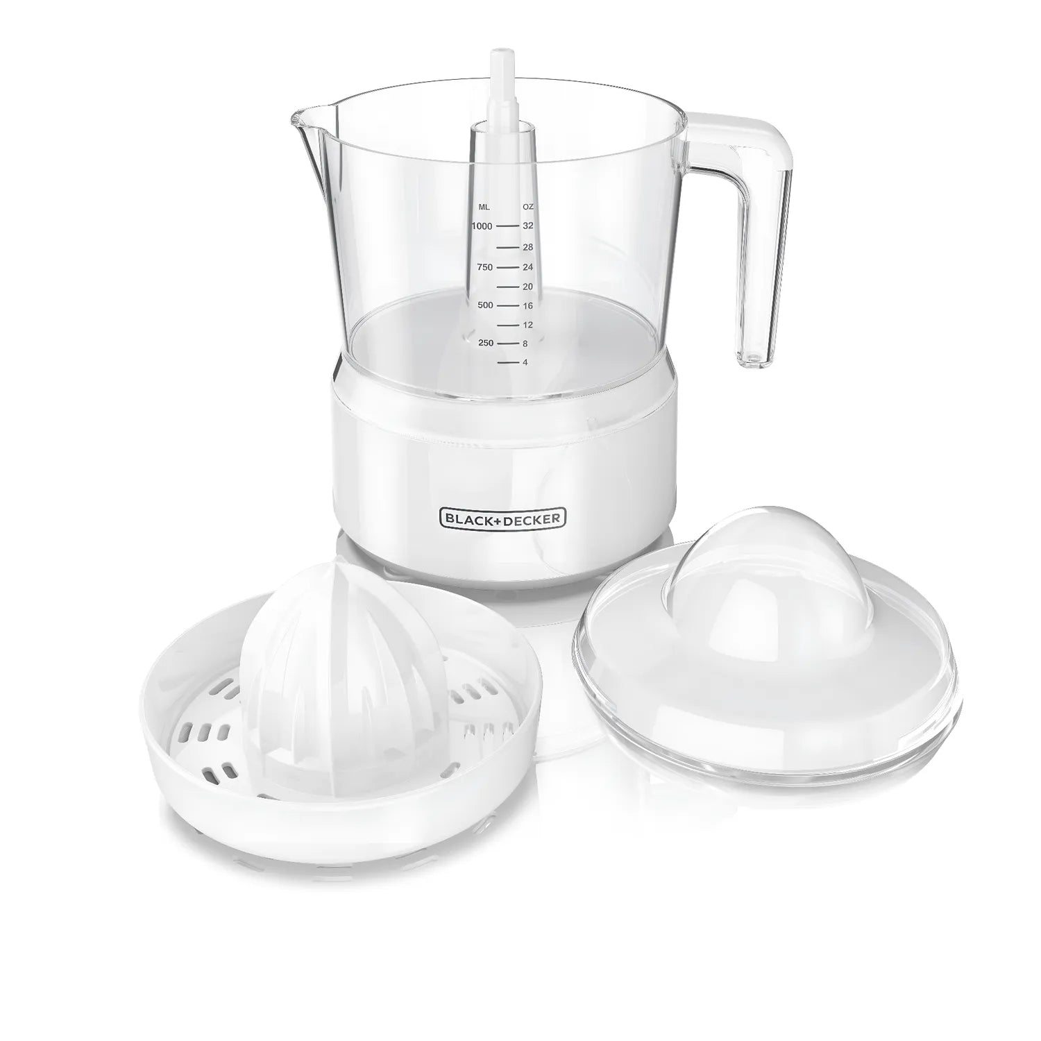 Exprimidor Eléctrico Black+Decker CJ650W-CL de 1 litro y 650 W, ideal para exprimir frutas grandes y pequeñas con rapidez y comodidad.