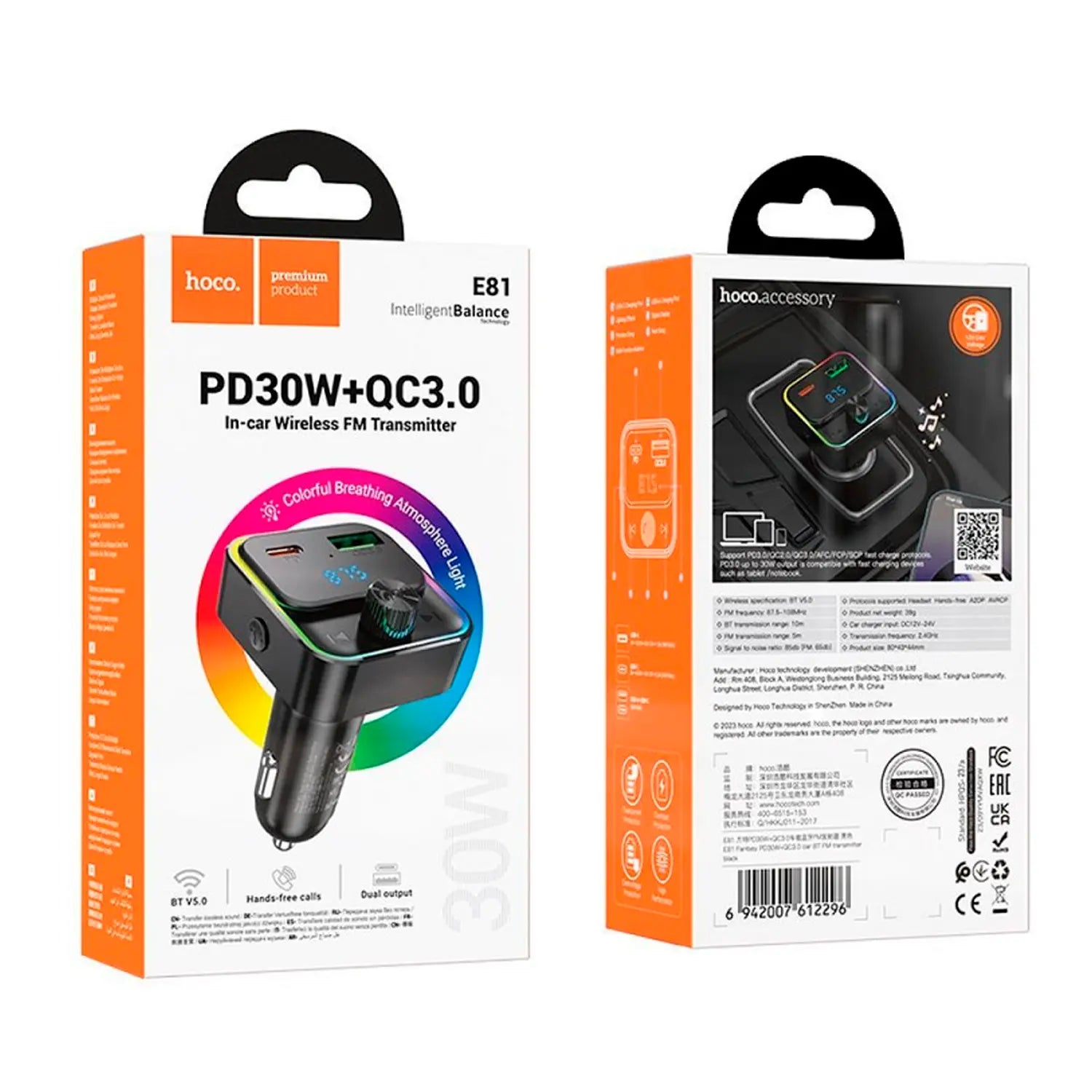Transmisor FM Hoco E81 Fantasy en color negro, con capacidad de carga rápida PD30W + QC 3.0 y conectividad inalámbrica para reproducir música y cargar dispositivos en el auto.